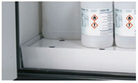 A bottom collection sump is a piece of possible interior equipment for all of the chemical storage cabinets we offer. The collection of leakages is crucial for the safe storing of chemicals.