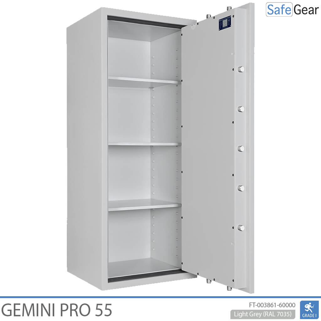 De deur is beveiligd met meerwandig en kwaliteitsvol staal en driezijdige bouten (Ø 25 mm). De Gemini Pro kan verankerd worden aan de vloer voor extra veiligheid tegen diefstal.